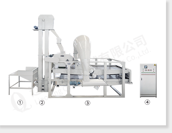 ① input hopper ② bucket elevator ③ main part of the equipment(dehullers,air separator and seed-kernel separator) ④ electric control cabinet