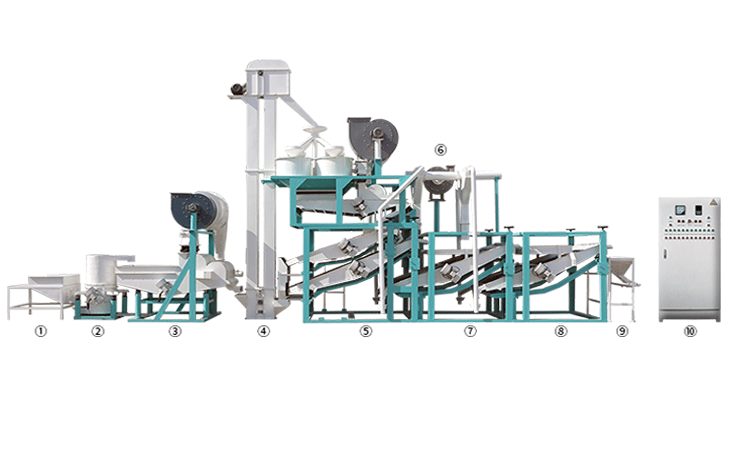 上料斗原料提升機(jī) 多功能除雜機(jī) 斗式提升機(jī) 脫殼、風(fēng)選、分選主機(jī) 風(fēng)力回料系統(tǒng) 籽仁復(fù)選機(jī)1 籽仁復(fù)選機(jī)2 接料斗 電氣控制柜